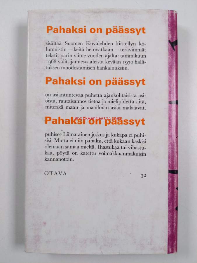 Hyvä. Tarkempi kuntoluokka: K3+ ; Hieman kulumaa kansissa. Kansipaperin kunto: jonkin verran kulumaa/pienoisia repeämiä