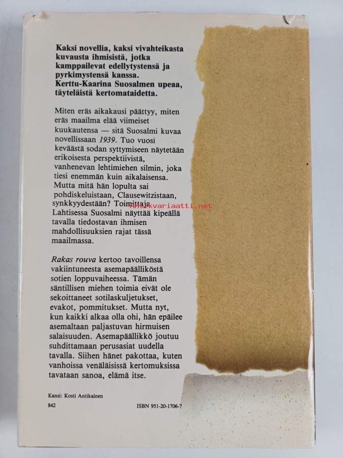 Hyvä. Tarkempi kuntoluokka: K3+ ; Pienoista kulumaa kansissa, selkämyksessä hieman vinoutta. Kansipaperin kunto: pienoista kulumaa reunoilla, muuten erinomainen