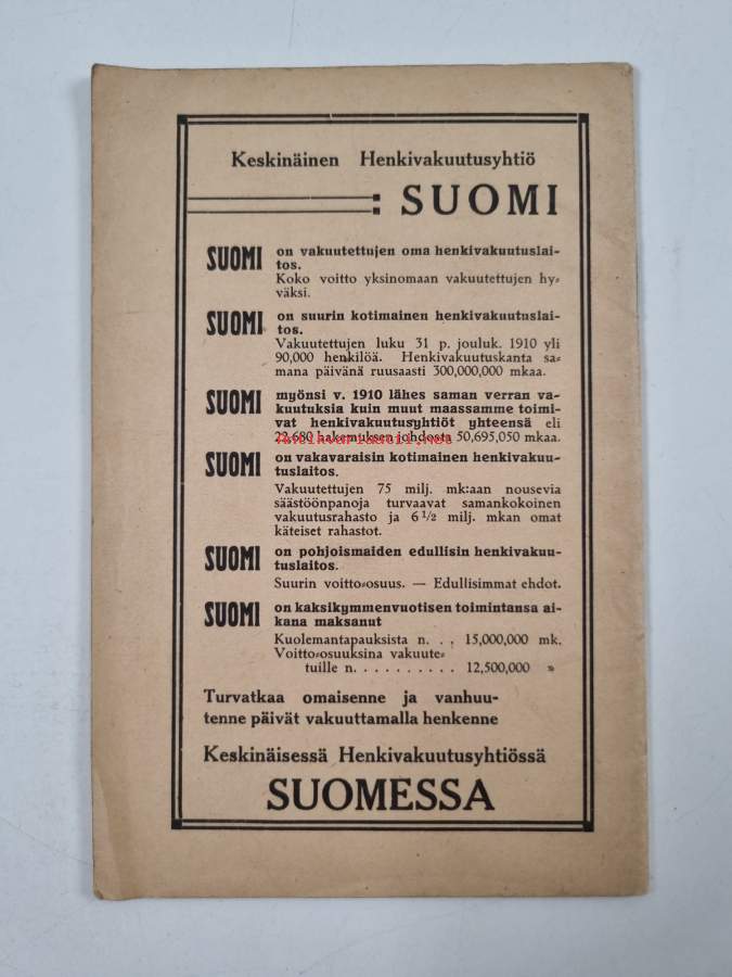 Hyvä. Tarkempi kuntoluokka: K3- ; Hieman taitejälkeä alakulmissa, selkämyksessä aavistus vinoutta. teksti fraktuuraa
