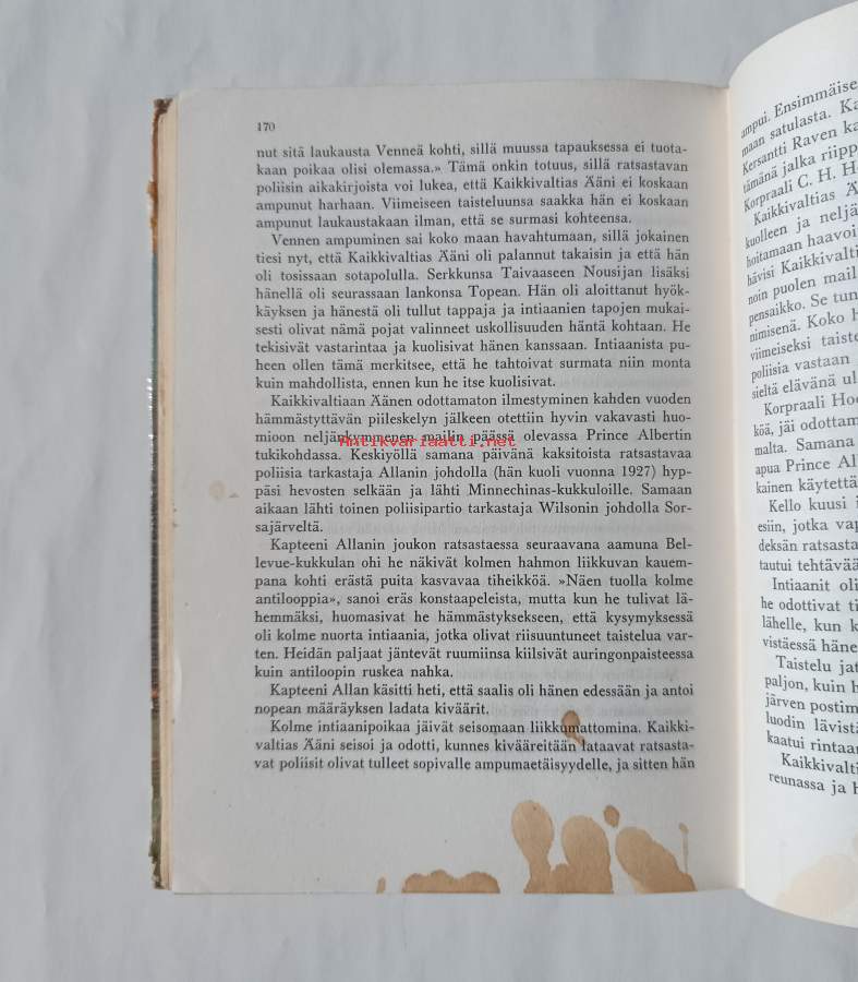 Tyydyttävä. Kansissa selvää repeymää, kulumaa ja likaa. Kannesta irronnut muovia. Etulehdellä eri omistajien merkintöjä. Etusivu irronnut toisista sivuista, mutta kiinni kannenlehdellä. Kosteusvaurioita kirjan sivuilla.