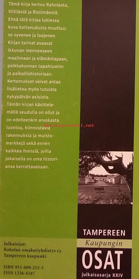 Teos kertoo Raholan, Villilän ja Ristimäen kaupunginosien historiasta, ihmisistä ja arjesta + muistoja, valokuvia, karttoja ja tarinoita, jotka tuovat esiin alueiden kehityksen ja yhteisöllisyyden. Kuvitettu. Dimensiot 25 ¤ 17 cm