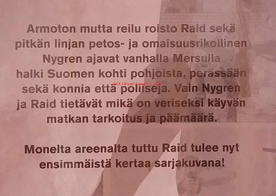 Raid ja vanha rikoskumppani Nygren ajavat vanhalla Mersulla halki Suomen kohti pohjoista. Matkan varrella heitä seuraavat sekä poliisit että konnat, ja vain he itse tietävät verisen reissun todellisen tarkoituksen. Kuvitettu. Dimensiot 25 ¤ 17 cm.