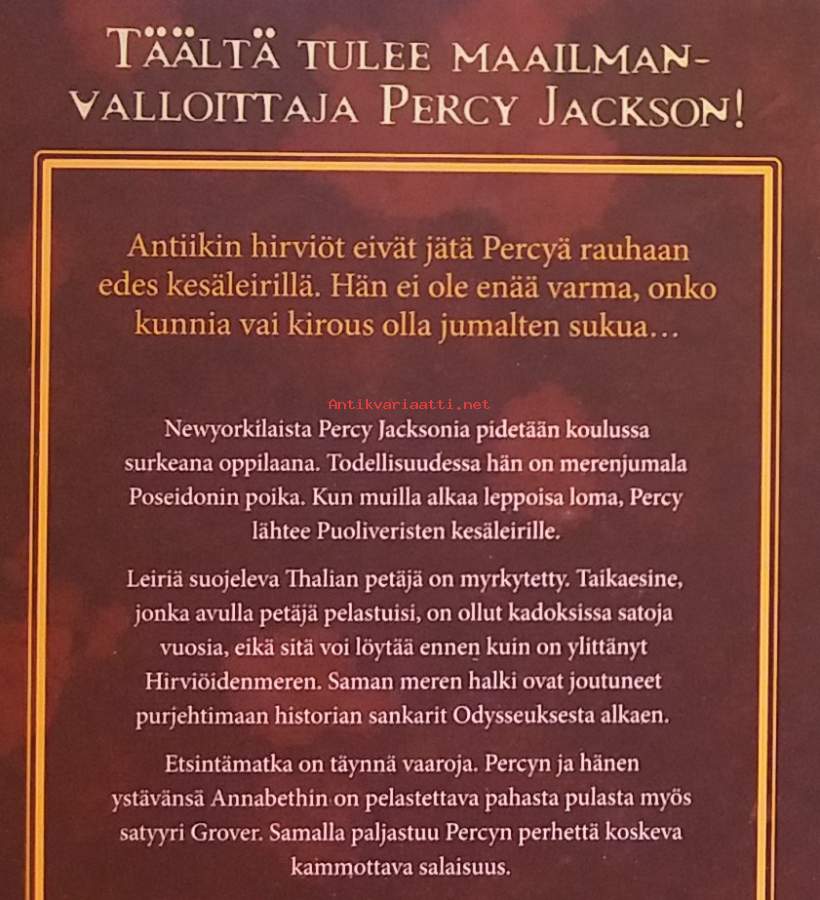 Percy ei ole enää varma, onko kunnia vai kirous olla jumalten sukua.Kun muilla alkaa leppoisa loma, merenjumala Poseidonin poika Percy lähtee Puoliveristen kesäleirille. Eivätkä antiikin hirviöt jätä häntä sielläkään rauhaan. Dimensiot 21 ¤ 15 cm.