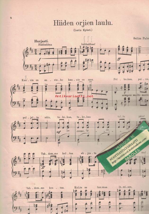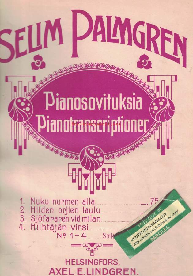 1. Nuku nurmen alla 2. Hiiden orjien laulu 3. Sjöfararen vid milan 4. Hiihtäjän virsi