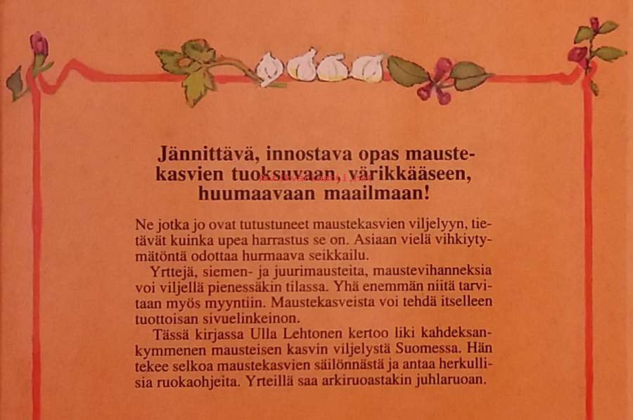 Teos kertoo liki 80 mausteisen kasvin viljelystä Suomessa + niiden säilöntä ja käyttö ruokaohjeissa. Kuvitettu. Dimensiot 24 ¤ 18 cm