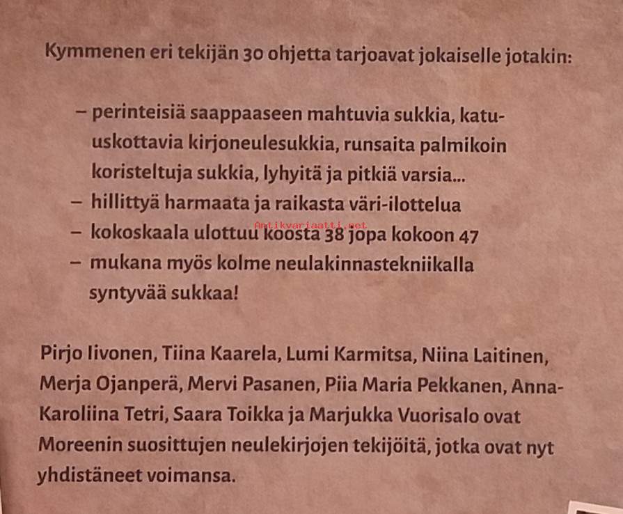 30 erilaista sukkamallia miehille Moreenin suosituilta suunnittelijoilta. Kukin kymmenestä tekijästä on suunnitellut kaksi uutta sukkamallia ja valinnut lisäksi yhden vanhan toivemallin.Klassikko jo syntyessään! perinteisistä saappaaseen mahtuvista sukista neulakinnastekniikalla syntyviin sukkiin. Kuvitettu. Dimensiot 26 ¤ 21 cm.