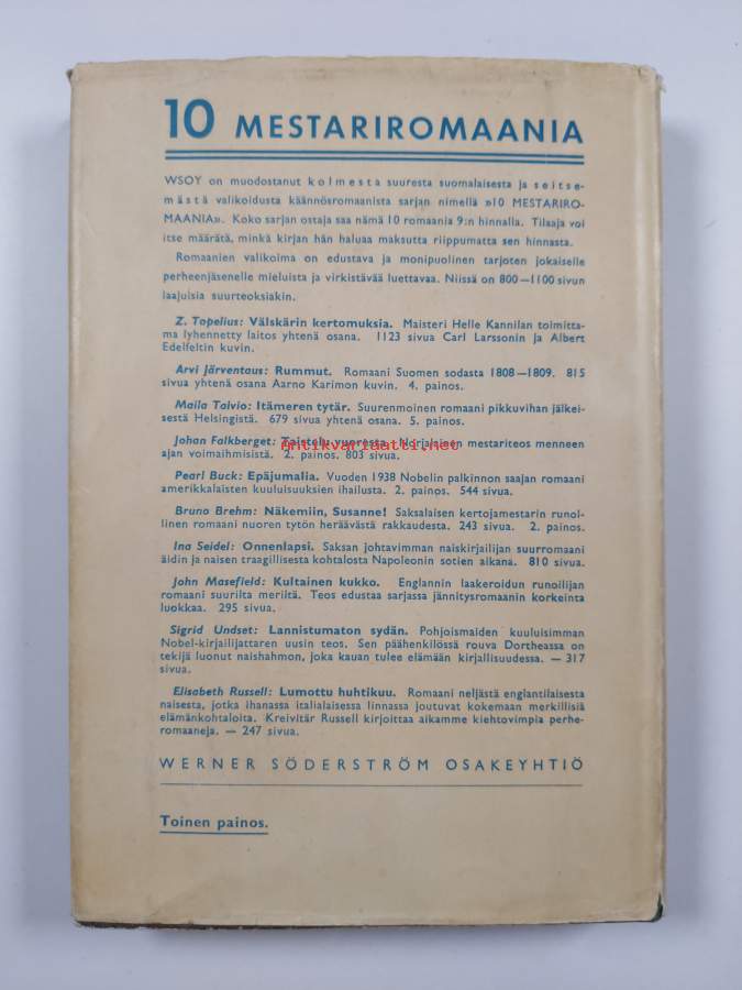 Hyvä. Hieman kulumaa kansissa, selkämyksessä hieman vinoutta. Kansipaperin kunto: joitain repeämiä/kulumaa & tahraisuutta