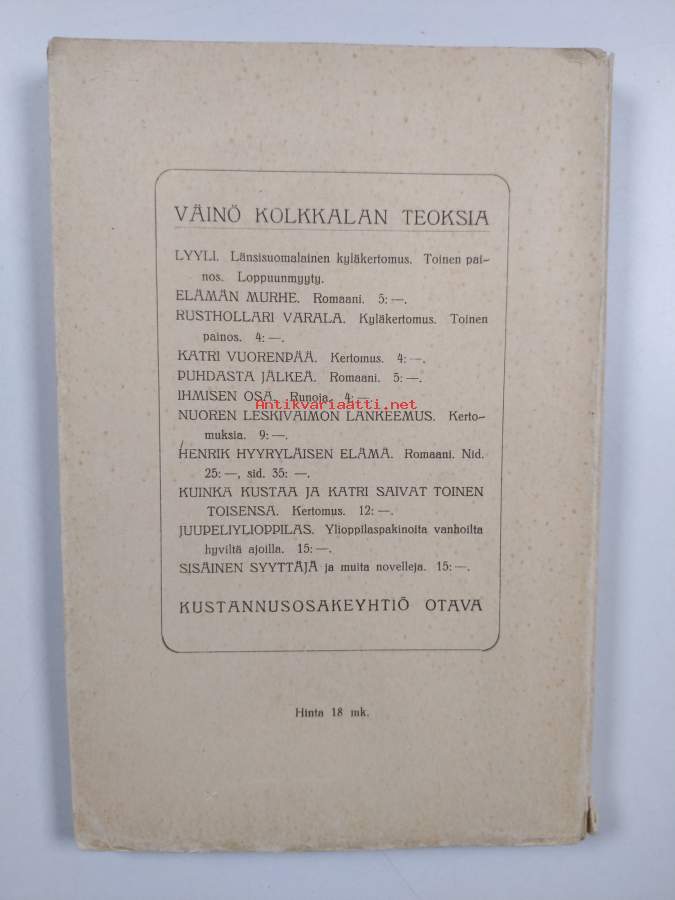 Tyydyttävä. Tarkempi kuntoluokka: K2+ ; Hieman repeämää kansissa, selkämyksessä aavistus vinoutta