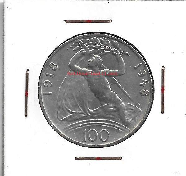 OminaisuuksiaLiikkeellelaskija Tšekkoslovakia Jakso Kansantasavalta (1948-1960)Tyyppi Ei-liikkeessä olevat kolikotVuosi 1948Arvo 100 KorunValuutta Koruna (1945-1953)Sävellys Hopea (.500)Paino 14 gHalkaisija 31 mmPaksuus 2,3 mmMuoto PyöreäTekniikka JauhettuSuunnistus Mitalin kohdistus ↑↑Demonetisoitu 31. toukokuuta 1953Numero N#12650ApuaViittaukset KM# 27, Schön# 34