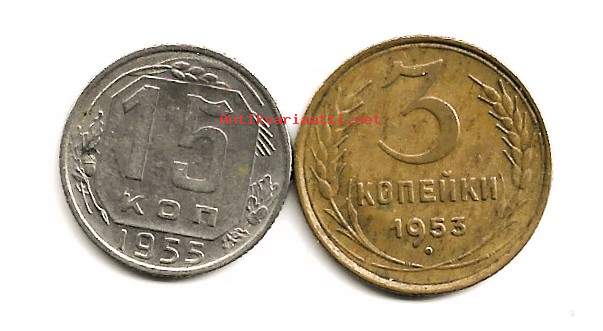 Neuvostoliitto 3 ja 15 kop 1953-55 - ulkomainen kolikko 2 kpl
