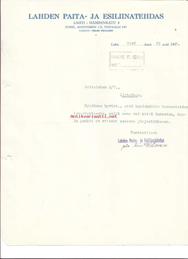 Lahden Paita- ja Esiliinatehdas Lahti 1931 - firmalomake