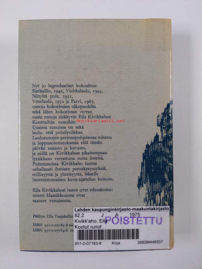 Tyydyttävä. Pienoista kulumaa kansissa, kontaktimuovipäällystys, kirjaston poistokirja, selkämyksessä hieman vinoutta