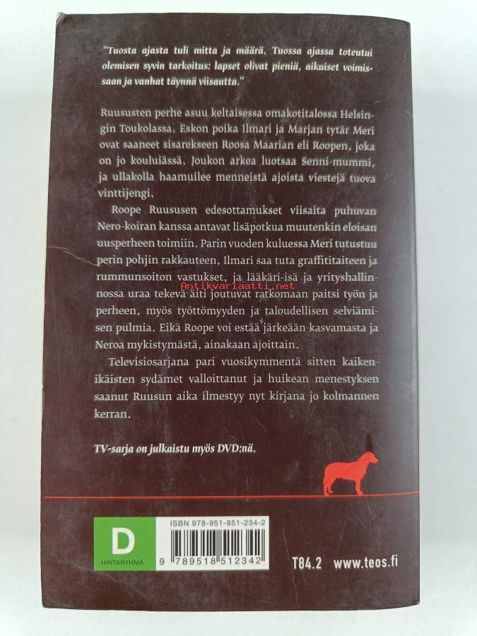 Hyvä. Pienoista kulumaa kansissa, pienoista kolhua reunoilla ja kulmissa, selkämyksessä aavistus vinoutta, selkämyksessä lukutaittumaa, edessä vanha hintalappu