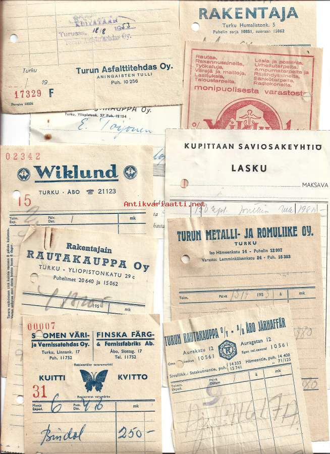 1950 luvun Paragon yms kuitteja 10 eril firmalomake