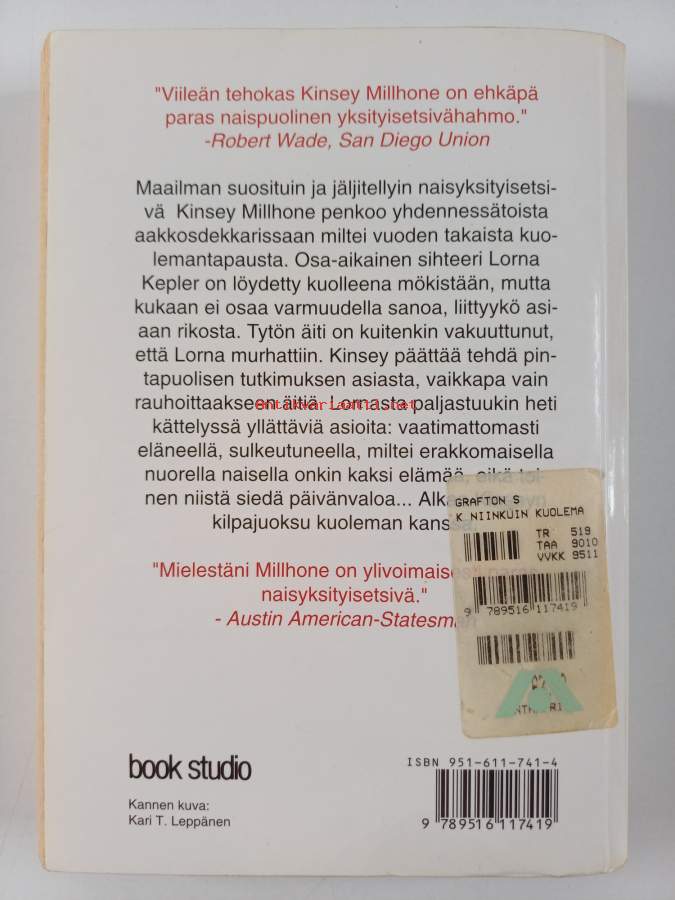 Tyydyttävä. Tarkempi kuntoluokka: K2- ; Pientä läikkää, hieman kulumaa kansissa, selkämyksessä hieman vinoutta, takana vanhoja hintalappuja, sidos hieman näkyvissä yhdellä aukeamalla