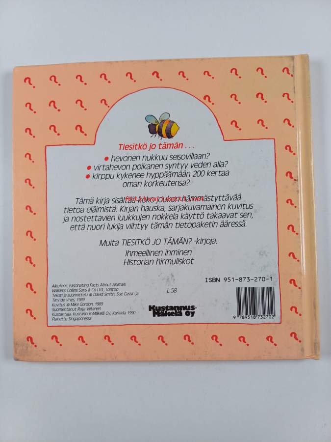 Muu(t) tekijä(t): Raija Viitanen, Mike Gordon ym.Merkinnät: omistajamerkintäSarja: Tiesitkö jo tämän?Alkuteos: Fascinating facts about animalsAsiasanat: eläimet, lastenkirjallisuus, käännökset, suomenkielinen kirjallisuus, kuvakirjat