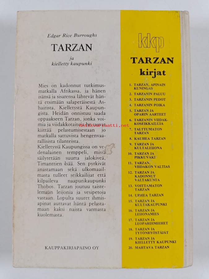 Muu(t) tekijä(t): Jaakko V. Tapio, Kalevi LintulaMerkinnät: omistajamerkintäSarja: Tarzan 19Alkuteos: Tarzan and the forbidden cityAsiasanat: nuortenkirjallisuus, seikkailukirjallisuus, afrikka, sarjakertomukset, viidakot