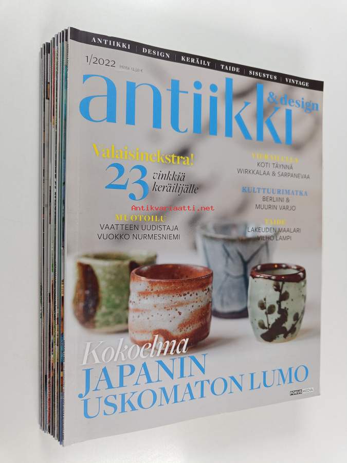 Hyvä. Hieman kulumaa reunoilla. Antiikki & Design vuosikerta 2022 n:ot 1-10 yksittäisnumeroina, osoitetiedot leikattu pois takakansista, joista puuttuu yläosa