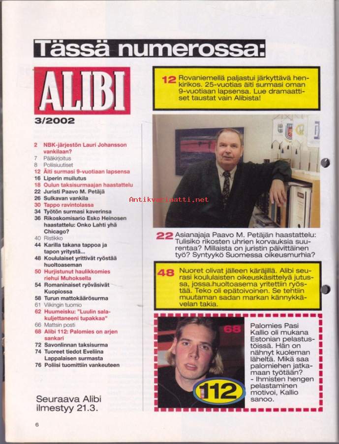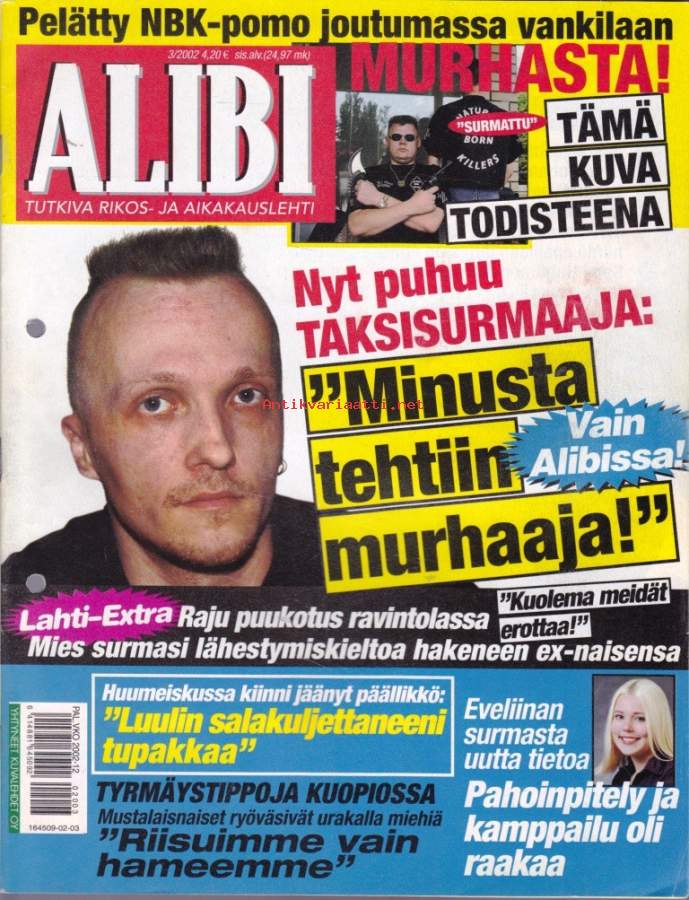 Alibi 2002 N:o 3. Nyt puhuu taksisurmaaja. Raju puukotus ravintolassa. Romaninaiset ryöväsivät Kuopiossa.