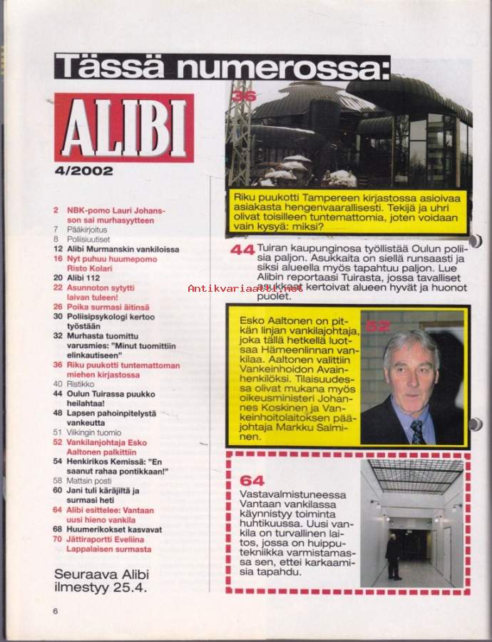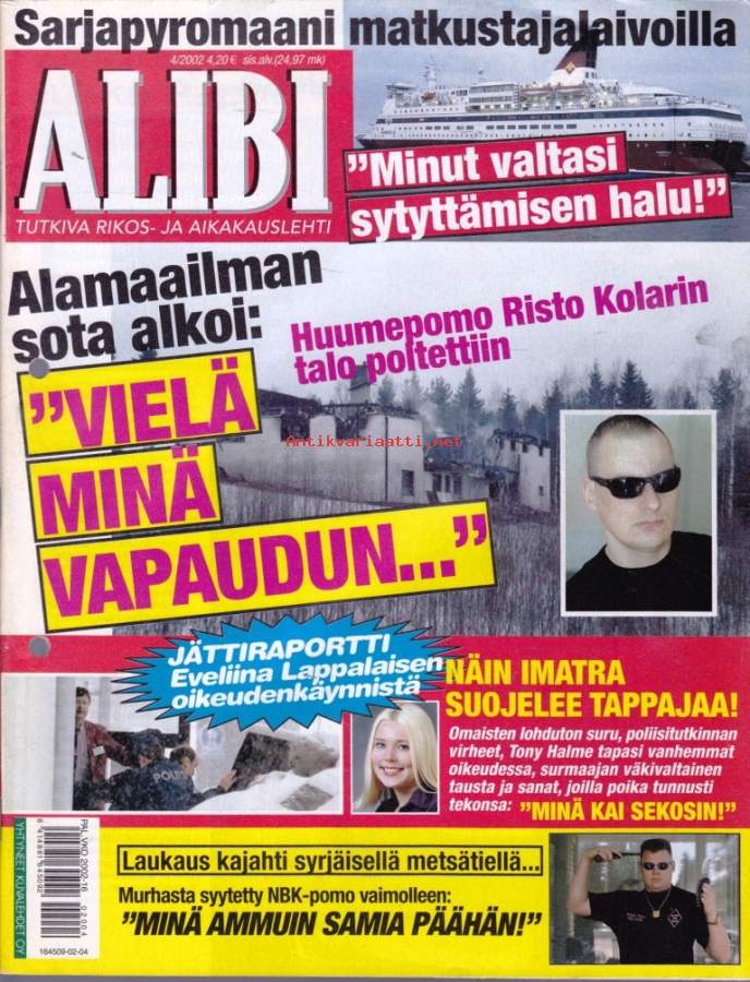 Alibi 2002 N:o 4. Minä ammuin Samia päähän. Sarjapyromaani matkustajalaivoilla. Jättiraportti Eveliina Lappalaisen surmasta.