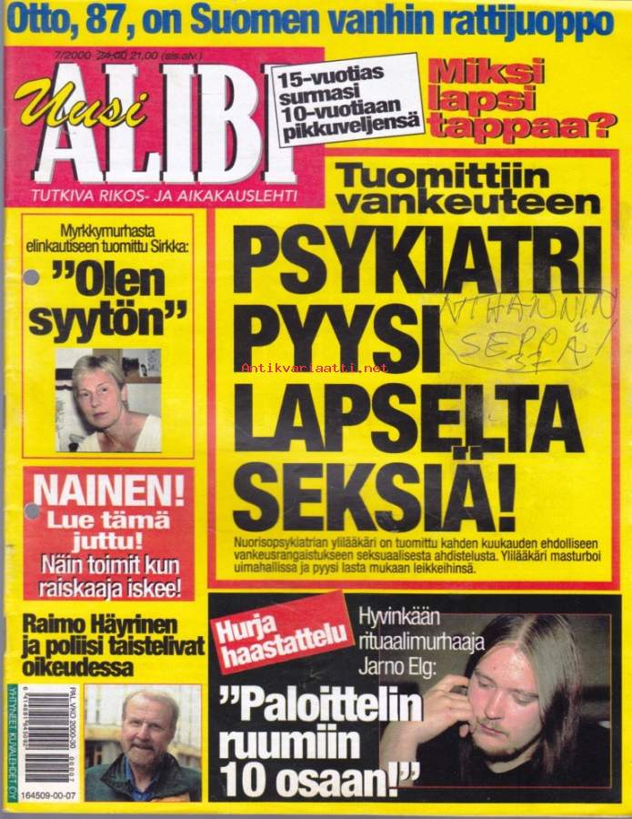 Alibi 2000 N:o 7. Suomen vanhin rattijuoppo Otto on 87-v. Psykiatri pyysi lapselta seksiä. Hyvinkään rituaalimurhaaja Jarno Elg.