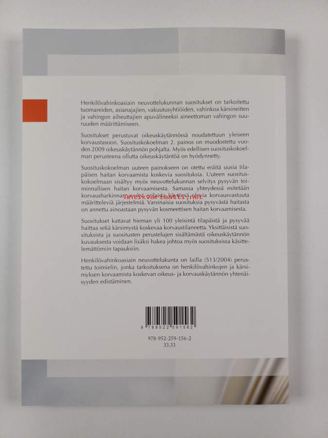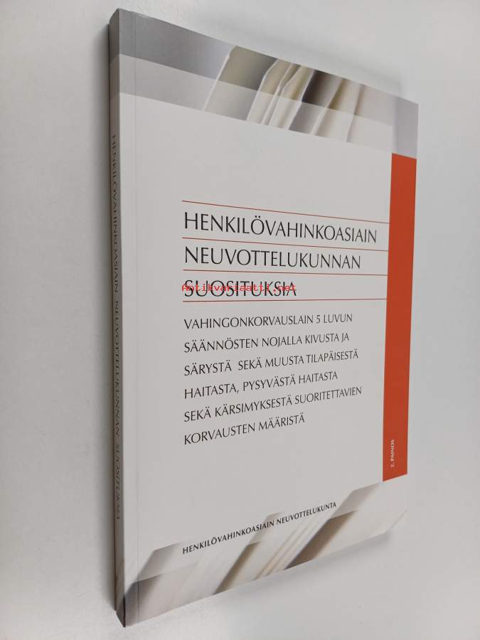 Koko nimi: Henkilövahinkoasiain neuvottelukunnan suosituksia : vahingonkorvauslain 5 luvun säännösten nojalla kivusta ja särystä sekä muusta tilapäisestä haitasta, pysyvästä haitasta sekä kärsimyksestä suoritettavien korvausten määristäAsiasanat: lainsäädäntö, vahingonkorvaus, henkilövahingot, suositukset