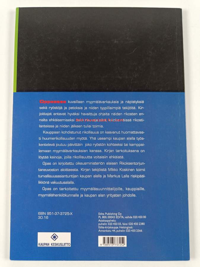 Muu(t) tekijä(t): Markus LallaSarja: Kaupan keskusliiton julkaisu 1Asiasanat: ennaltaehkäisy, ryöstö, vähittäiskauppa, turvallisuus, rikokset, rikollisuus, yhteistyö, Varkaus, torjunta, kauppa-ala, myymälät, petos, rikoksentorjunta, toimenpiteet, valvontalaitteet, myymälävarkaus