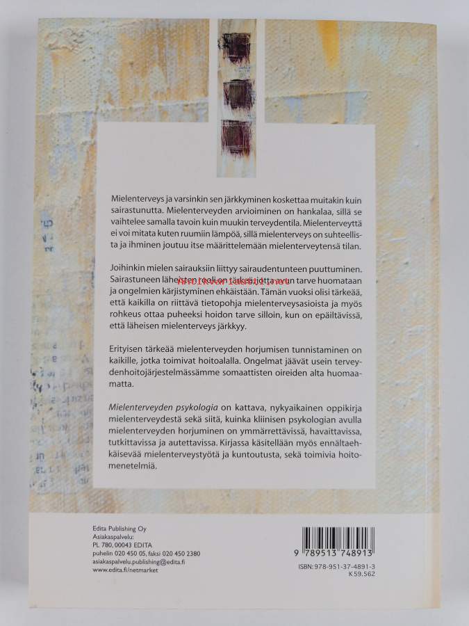 Merkinnät: ylivedetty omistajamerkintäAsiasanat: psykologia, mielenterveys, hoitomenetelmät, työelämä, mielenterveyshäiriöt, psykoterapia, elämänkaari, stressi, persoonallisuushäiriöt, psykiatrinen hoito, psykososiaalinen kuntoutus, ehkäisevä mielenterveystyö, mielenterveystyö, kliininen psykologia, ahdistuneisuushäiriöt, mielenterveyskuntoutus, psykiatrisk vård, behandlingsmetoder, psykoterapi, psykologi, mental hälsa, mentala störningar, stress, Mental Disorders, Mental Health, arbetsliv, personlighetsstörningar, kokeellinen psykologia, levnadslopp, förebyggande mentalhygien, mentalvårdsarbete, klinisk psykologi, experimentell psykologi, psykosocial rehabilitering, persoonallisuusteoriat, psykisk rehabilitering, personlighetsteorier, ångestsyndrom