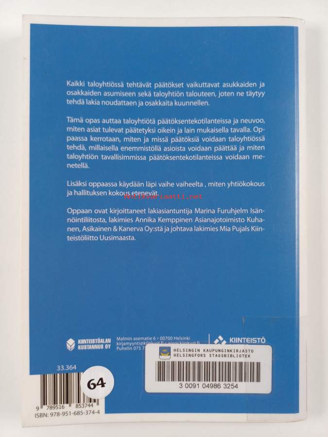 Muu(t) tekijä(t): Mia Pujals, Annika KemppinenAsiasanat: lainsäädäntö, päätöksenteko, asunto-osakeyhtiöt, osakeyhtiöt, vastuu, hallinto, osakkaat, kiinteistöosakeyhtiöt, kiinteistönhoito, yhtiökokoukset, kunnossapito