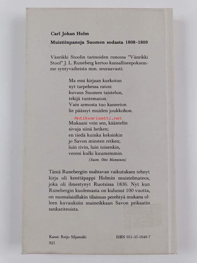 Muu(t) tekijä(t): Arto Ingervo, Kirsti IngervoMerkinnät: omistajamerkintä & exlibris: Kalevi RajalaAlkuteos: Anteckningar öfver fälttågen emot Ryssland åren 1808 och 1809