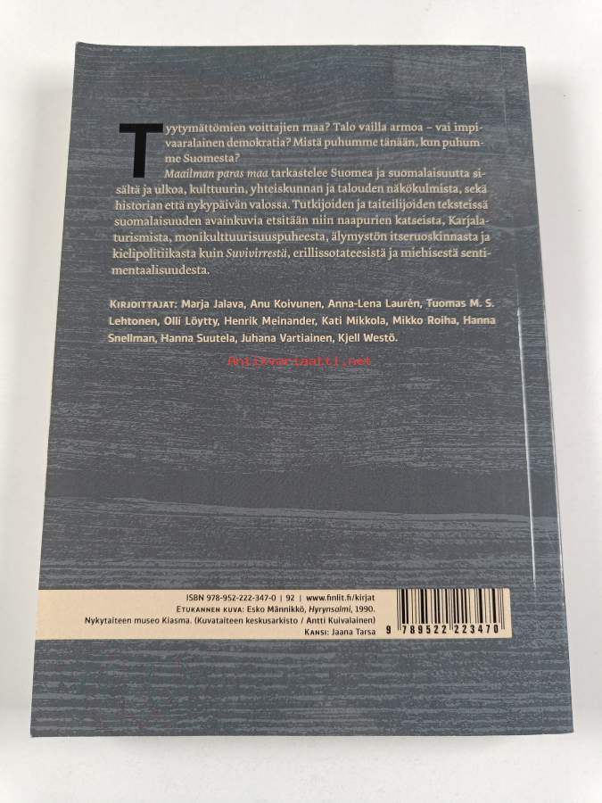 Sarja: SKS:n toimituksia 1362; Suomalaisen Kirjallisuuden Seuran toimituksia 1362Asiasanat: suomen kieli, suomalaisuus, sotahistoria, yhteiskuntakuvaus, kulttuurihistoria, Suomi-kuva, suomalaiset, tapakulttuuri, hyvinvointivaltio, kulttuuri, virret, mielikuvat, mieheys, karjalaisuus, monikulttuurisuus, mieskuva, symbolit, kansallinen identiteetti, yhteiskunta, globalisaatio, dokumenttielokuvat, kielipolitiikka, stereotypiat, monikielisyys, alueellinen identiteetti, uussuomalaiset