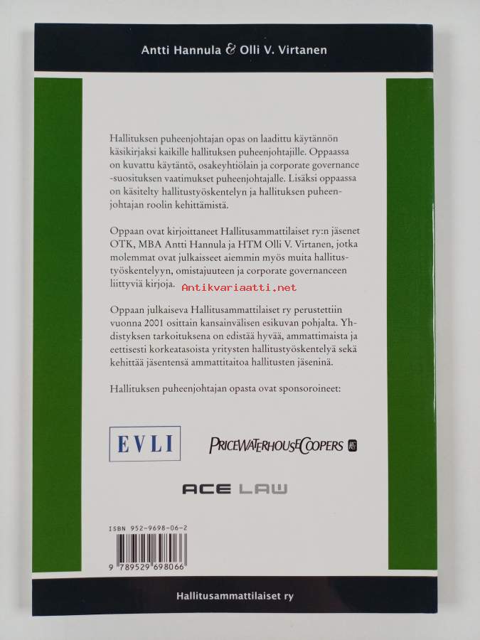 Muu(t) tekijä(t): Olli V. VirtanenAsiasanat: hallitukset, yritykset, osakeyhtiöt, yhtiöoikeus, hallinto, puheenjohtajat, hallintoelimet