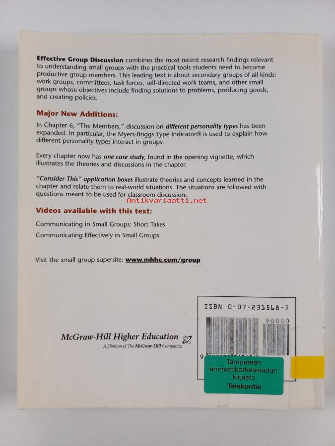 Muu(t) tekijä(t): Gloria J. Galanes, Katherine AdamsSarja: Speech seriesAsiasanat: viestintä, joukkopsykologia, keskusteluryhmät, pienryhmät, ryhmät, grupper, kommunikation, masspsykologi, Discussion, smågrupper, diskussionsgrupper, Small groups, Communication in small groups, Group problem solving