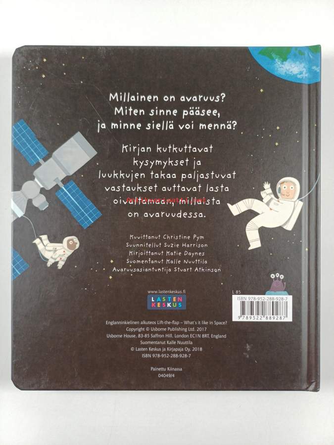 Muu(t) tekijä(t): Christine Pym, Kalle NuuttilaSarja: Fiksut faktatAlkuteos: What’s it like in space?Asiasanat: avaruusalukset, astronautit, avaruus, planeetat