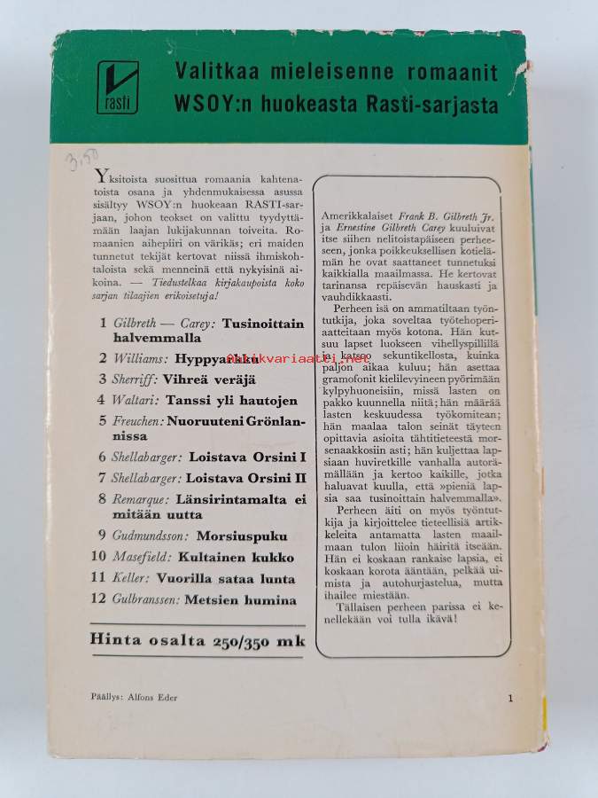 Hyvä. Hieman kolhua kulmissa, selkämyksessä hieman vinoutta. Kansipaperin kunto: kulumaa/pienehköjä repeämiä & tahraisuutta