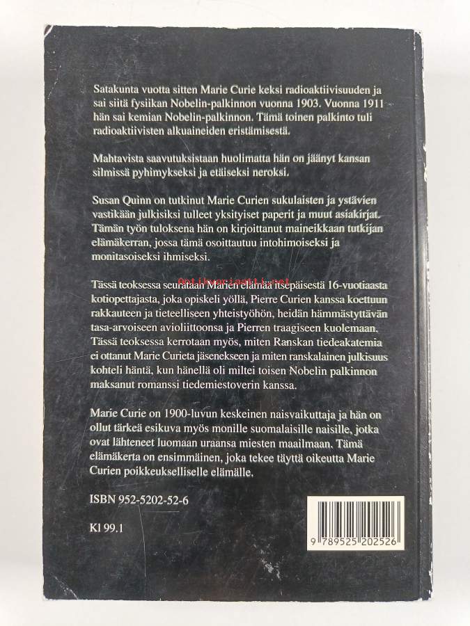 Muu(t) tekijä(t): Kimmo PietiläinenAlkuteos: Marie Curie : a lifeAsiasanat: elämäkerrat, tiedenaiset, kemistit