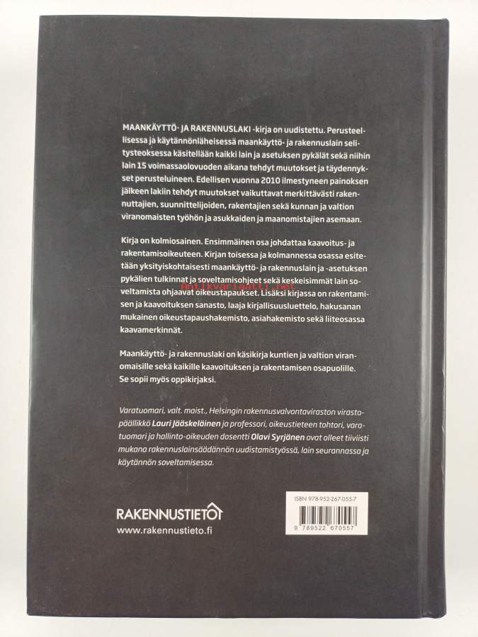 Muu(t) tekijä(t): Lauri Jääskeläinen, Olavi SyrjänenMerkinnät: omistajamerkintä (leima)Asiasanat: rakentaminen, lainsäädäntö, kaavoitus, maankäyttö, rakentamismääräykset, yleiskaavoitus, hallintomenettely, muutoksenhaku, maankäyttö- ja rakennuslaki, poikkeusluvat, rakennusluvat
