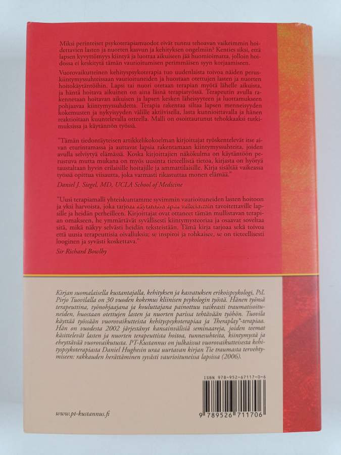 Muu(t) tekijä(t): Liisa Ritanen, Arthur Becker-Weidman ym.Alkuteos: Creating capacity for attachment : dyadic developmental psychotherapy in the treatment of trauma-attachment disordersAsiasanat: hoitomenetelmät, ihmissuhteet, hoito, tunne-elämän häiriöt, lapset, laitoshoito, mielenterveyshäiriöt, lasten kehitys, psykoterapia, traumat, vuorovaikutus, vanhemmat, huostaanotto, tunne-elämän kehitys, hoitolaitokset, kiintymys, varhainen vuorovaikutus, kiintymyssuhdeteoria, vuorovaikutusterapia, sijaishuolto, kaltoinkohtelu, lapset (ikäryhmät), vuorovaikutteinen kehityspsykoterapia, ryhmäkodit