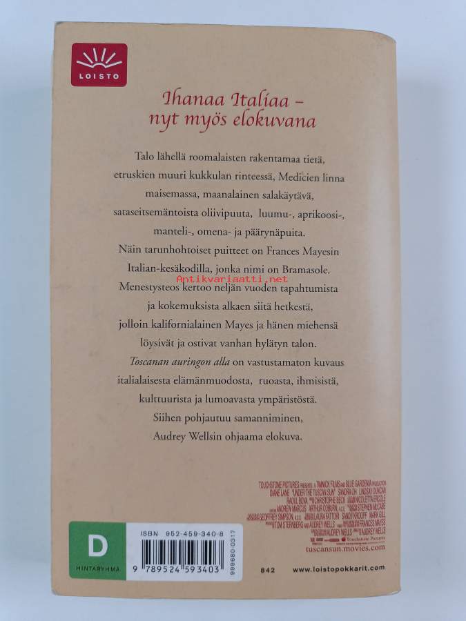 Muu(t) tekijä(t): Tuula SaarikoskiAlkuteos: Under the Tuscan sunAsiasanat: muistelmat, ruokaohjeet, ruokakulttuuri, Italia