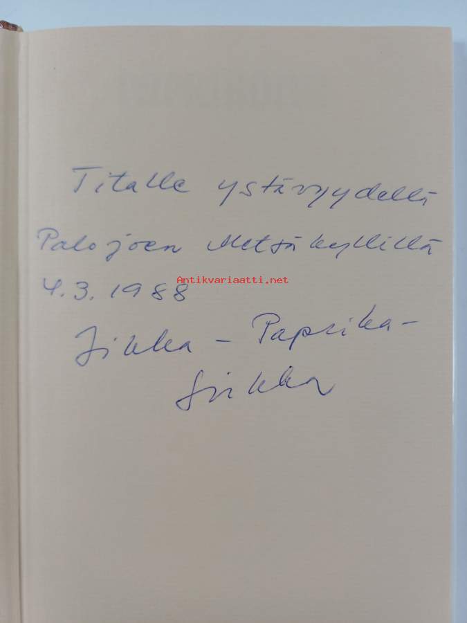 Hyvä. Hieman kolhua kansissa, pienoista kulumaa kansissa. Kansipaperin kunto: pientä kulumaa / tekijän signeeraama omiste