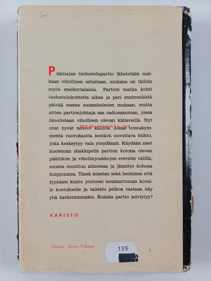 Hyvä. Hieman kulumaa kansissa, takana vanha hintalappu, selkämyksessä hieman vinoutta. Kansipaperin kunto: jonkin verran kulumaa/pienoisia repeämiä