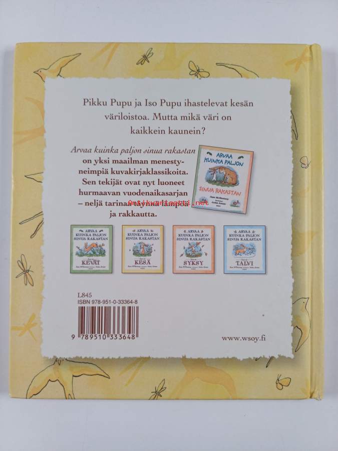 Muu(t) tekijä(t): Anneli Heimonen, Anita JeramMerkinnät: omistajamerkintäAlkuteos: Guess how much I love you in the summerAsiasanat: lastenkirjallisuus, värit, kesä, kuvakirjat