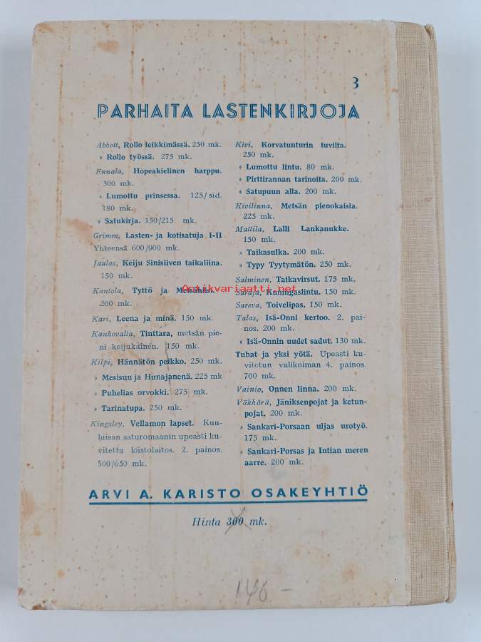 Tyydyttävä. Tarkempi kuntoluokka: K2- ; Pientä tahraisuutta, pientä kulumaa kansissa, hieman repeämää reunoilla ja kulmissa, muutamalla sivulla merkintää, selkämyksessä hieman vinoutta