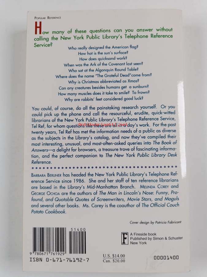 Book of Answers : The New York Public Library Telephone Reference Service's Most Unusual and Enter