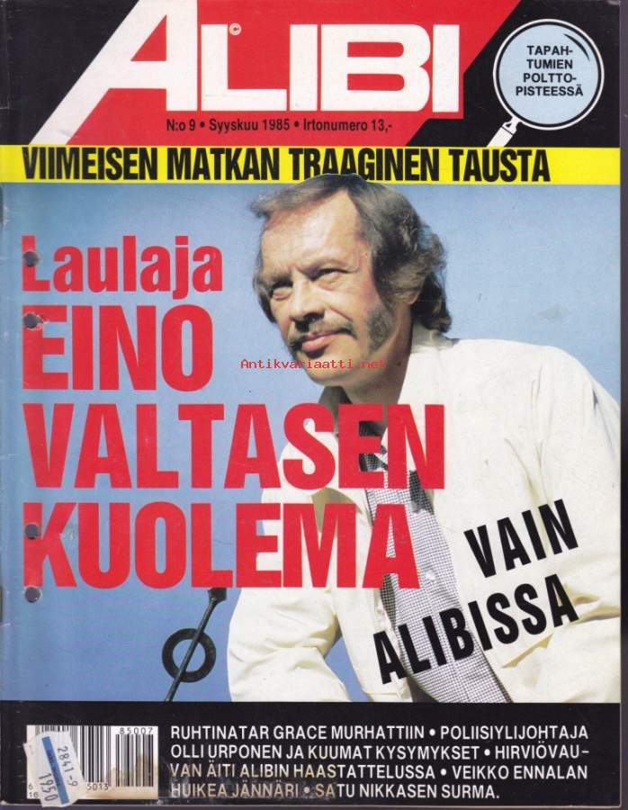 Alibi 1985 N:o 9. Laulaja Eino Valtasen kuolema. Iski kirveellä, ruumis kaivoon. Ruhtinatar Grace murhattiin.