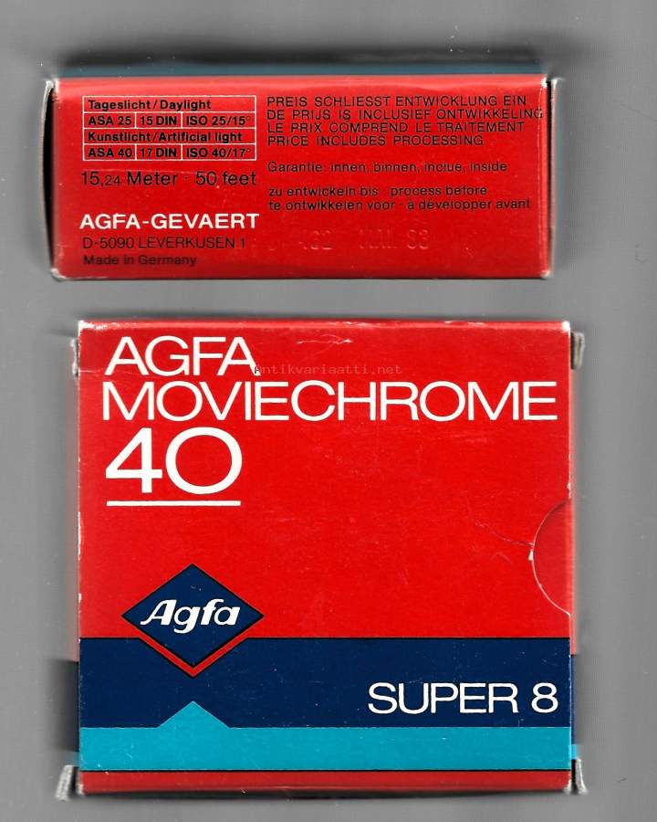 Agfa Moviechrome 40 Super 8, avaamaton filmirulla tuotepakkaus, dev before Mai 83