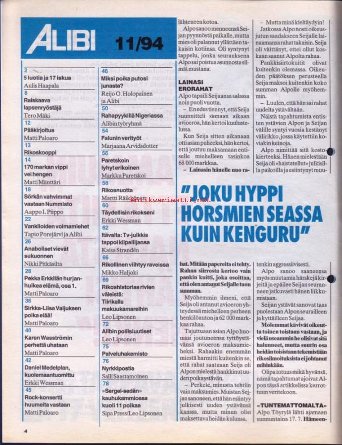 Alibi 1994 N:o 11. 5-vuotias lensi junasta. Alpo ampui tappaakseen. Pekka Erkkilän huikea elämä 1. Tiirikalla makuukamareihin