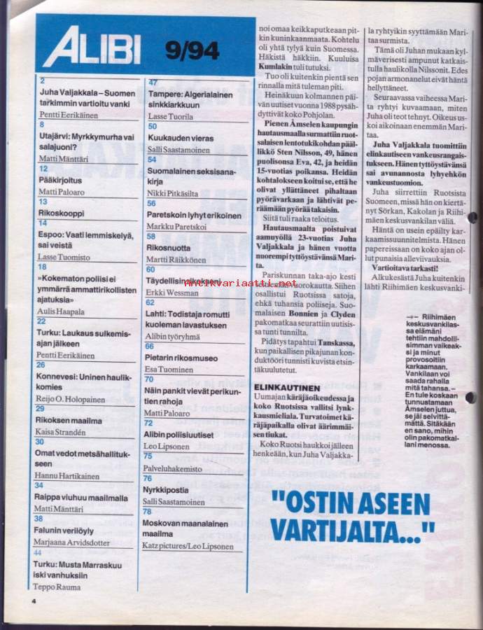 Alibi 1994 N:o 19. Juha Valjakkala - vaarallinen vanki. Lestadiolaissuvun uhri vai murhaaja? Veltto Virtasen täydellinen rikos