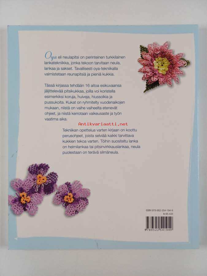Muu(t) tekijä(t): Simon Pask, Hanna Kolari ym.Alkuteos: Needle lace flowersAsiasanat: käsityöt, virkkaus, pitsit, käsityöperinne, neulapitsi