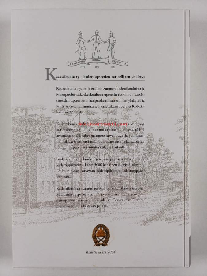 Muu(t) tekijä(t): Seppo UroAsiasanat: maanpuolustus, historia, henkilöhistoria, historiikit, sotilaskoulutus, puolustusvoimat, kurssijulkaisut, upseerit, asevoimat, kadettikoulut, perinteet, personhistoria, försvarsmakten, officerare, militär utbildning, historiker (verk), kurspublikationer, landets försvar, sotakorkeakoulut, kadettskolor, upseerikoulutus, kadettiupseerit